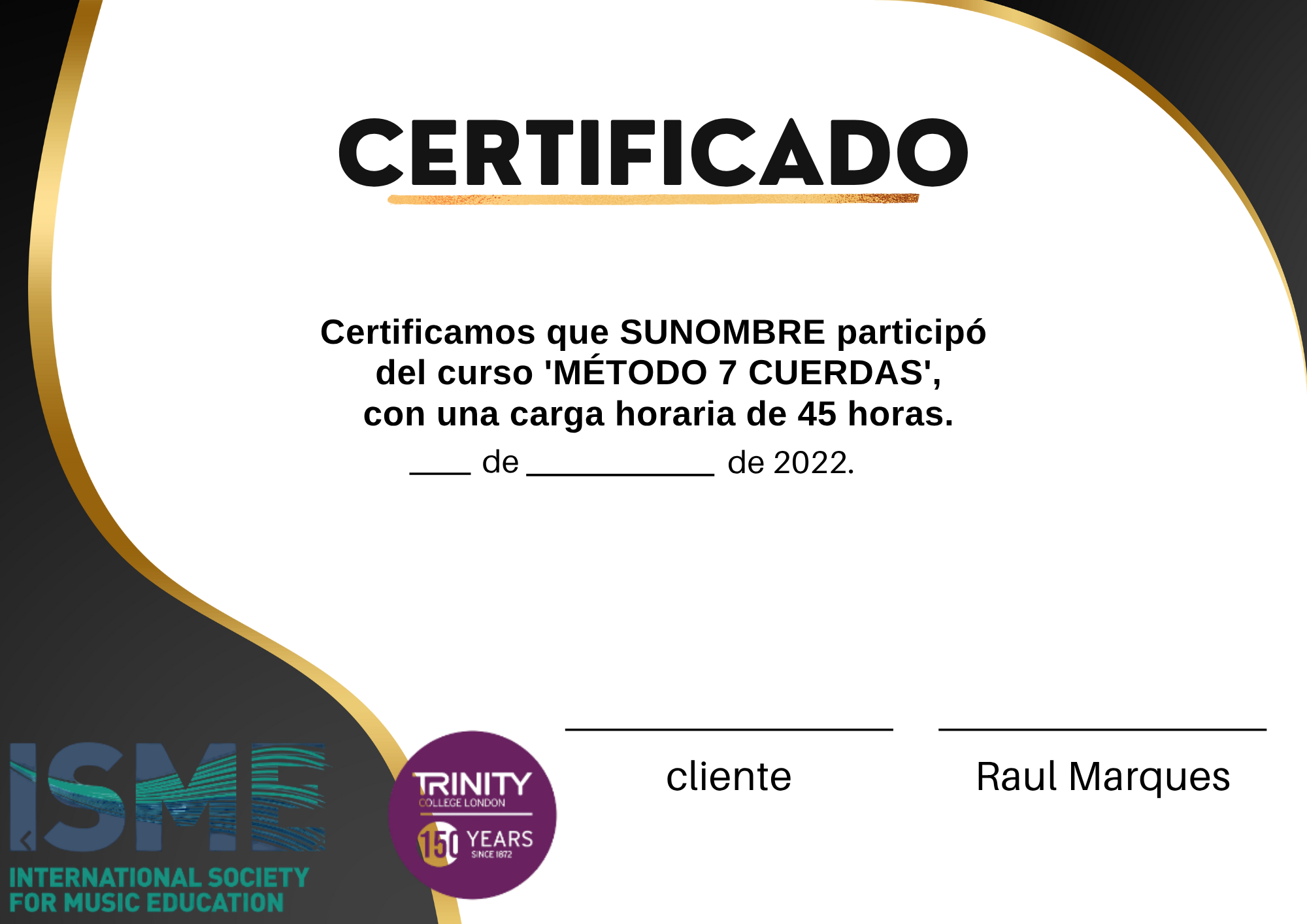 Nuestro curso está certificado por la International Society of Music Education (ISME) y por el Trinity College London, bajo los códigos de certificación respectivos. Esta certificación demuestra que nuestro contenido cumple con los más altos estándares internacionales de calidad en la enseñanza de técnicas musicales y educación de guitarra, reconociendo el curso como válido y confiable en diversos países del mundo.